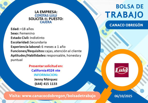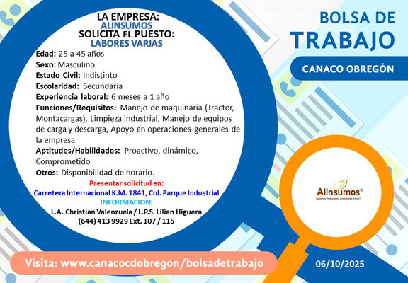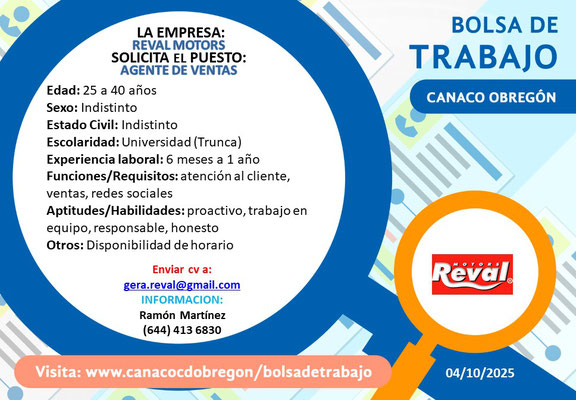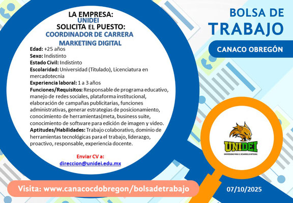 Ir al CursoLa Cámara de Comercio, Servicios y Turismo de Cd. Obregón es un organismo no gubernamental cuyo propósito es apoyar a las empresas locales fomentando el crecimiento económico ofreciendo servicios de calidad a sus afiliados, que van desde representatividad ante dependencias de gobierno, gestionar programas de apoyo, organizar eventos empresariales, pasando por otros servicios como renta de salones hasta servicios personalizados como bolsa de trabajo, programas de capacitación, diseño gráfico y publicidad.